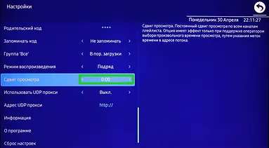The "Watch shift" function in the PHP version of the Ottplayer for TV Set-top boxes based on "Android" is still under development, we are waiting for updates. In order to shift the viewing, use the "Archive". Go to the settings of the player and set "Navigation Type" - "Tile".