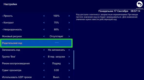 The default password is 0000. In the media player settings, you can change it, or remove it altogether. To do this, go to the player settings and in the "Parent Key" column, press 0000. Then enter your four-digit code.